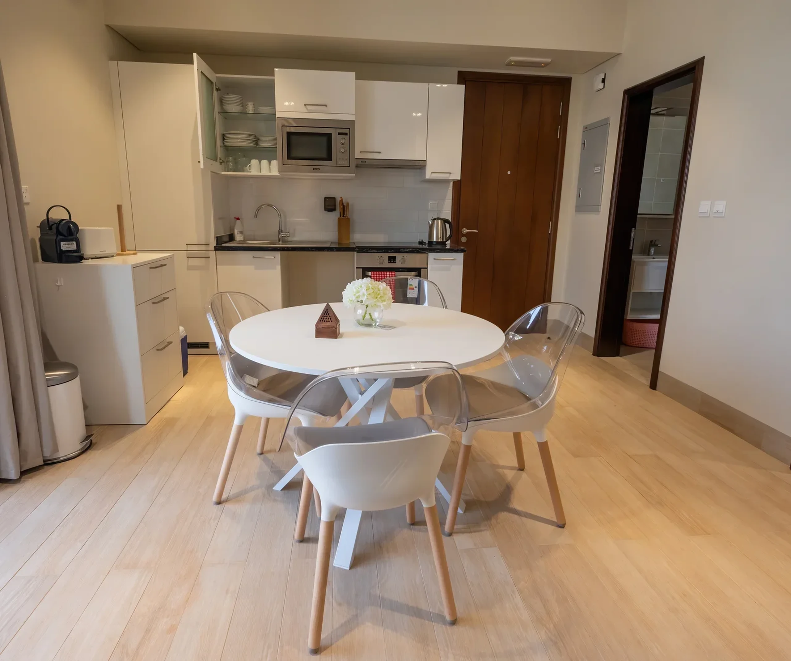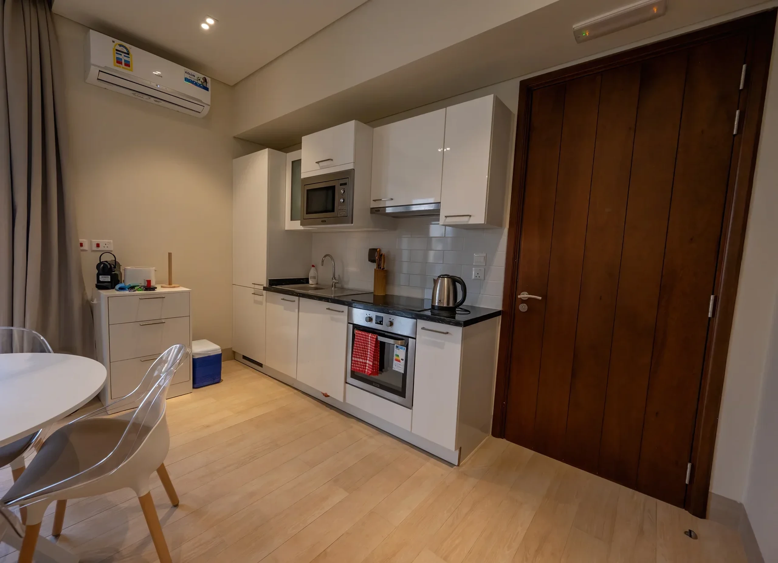 Apartmán Riviera 12-G01 nabízí klidné a komfortní ubytování v přízemí moderní budovy s přímým přístupem k bazénu. Ideální pro páry nebo menší rodiny, které hledají praktické zázemí jen pár kroků od pláže.